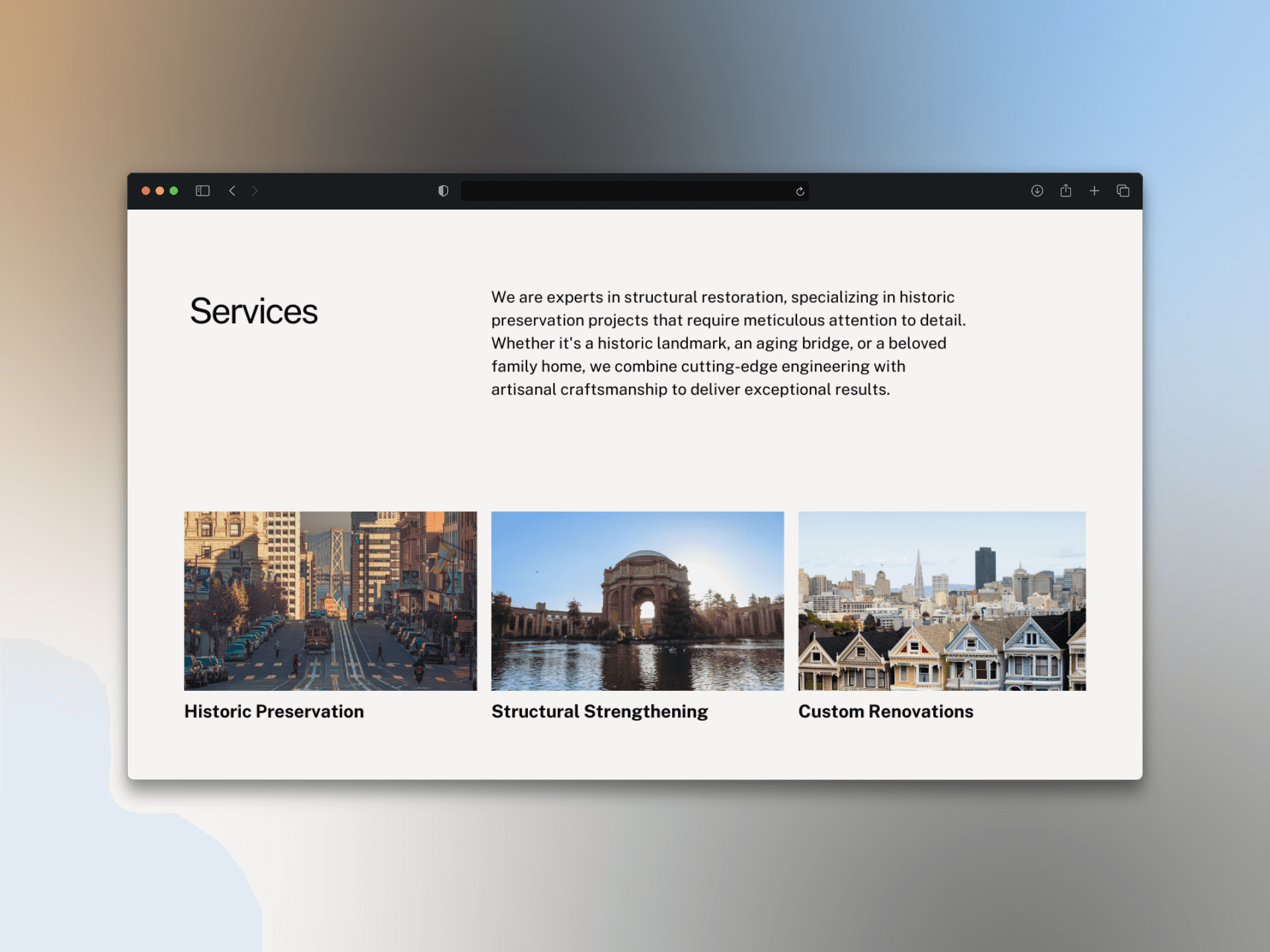 Immersive photography of restored landmarks and homes showcases the team’s attention to detail and technical excellence—positioning each project as a living testimonial.